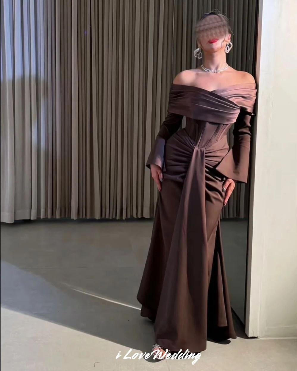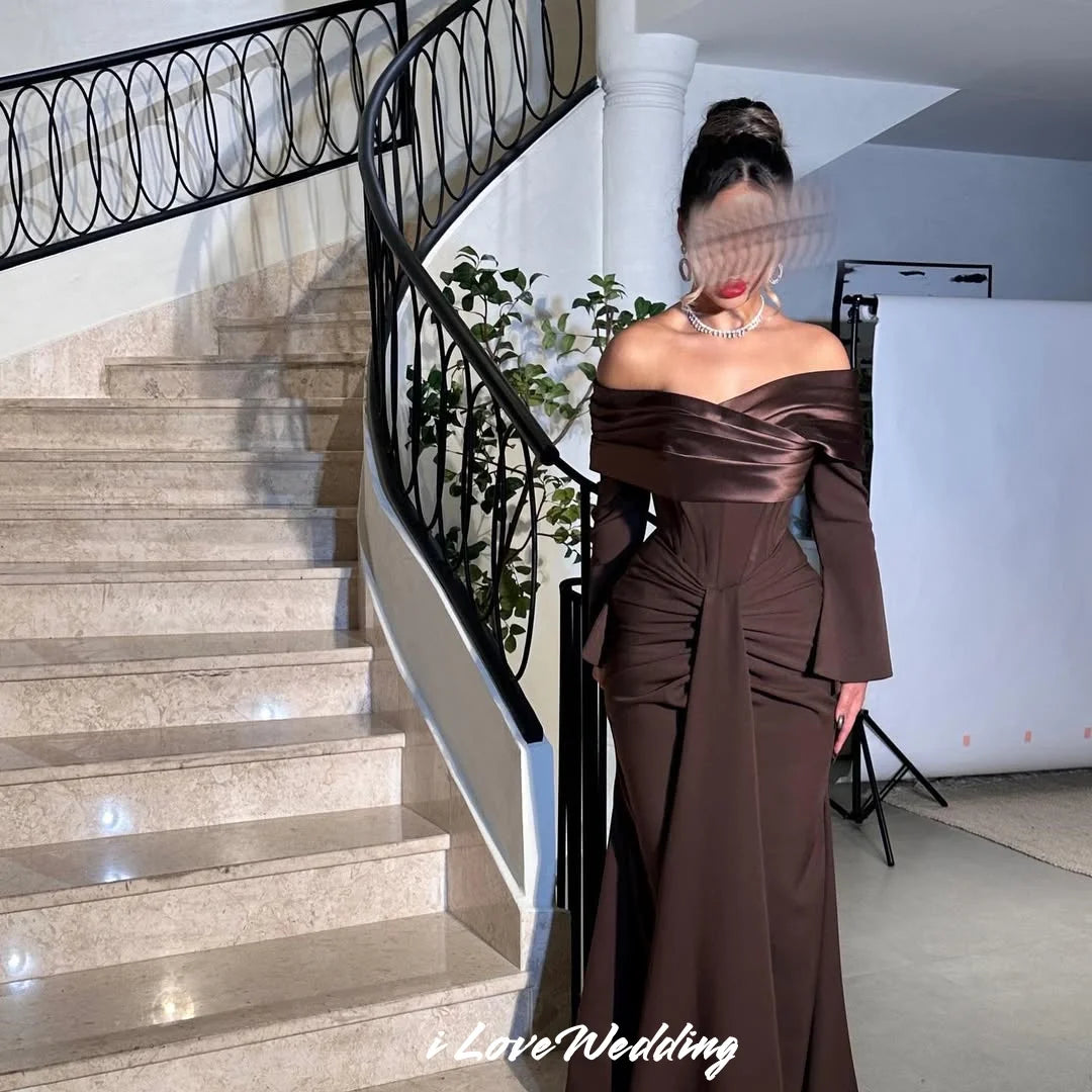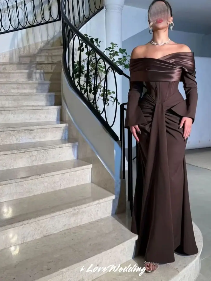 Brown Off the Shoulder Prom Dresses 2025 Satin Long Sleeve Corset Mermaid Pleated Backless Zip Wedding Party Dress Customized