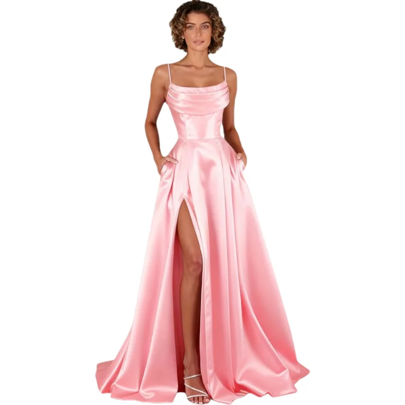 Customized Women's Spaghetti Straps Satin Prom Dresses with Slit Long A Line Formal Dress Evening Party Gowns with Pockets
