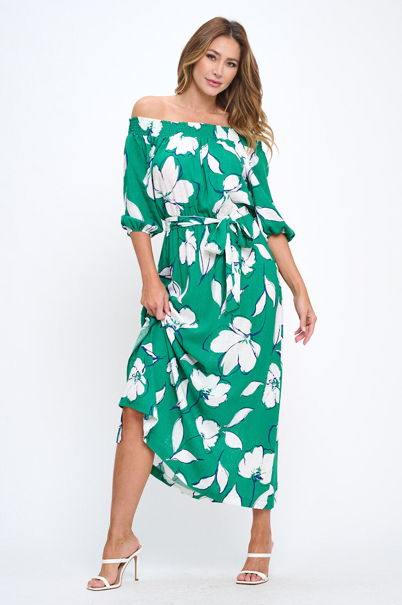 Made in USA Floral Print Versatile Neckline Maxi Dress with Tie. Available in other Colors. Fabric content: 70% Rayon, 30% Linen.