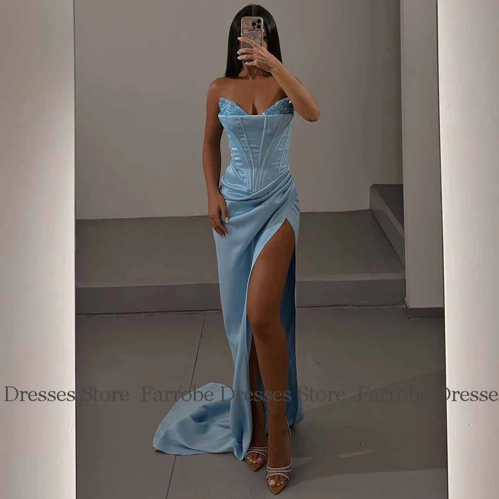 Luxury Evening Dresses 2025 Satin Mermaid/Trumpet Prom Dress Light Blue Sweetheart Beads Pleat Split Party Gown Sweep Train