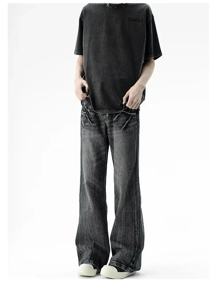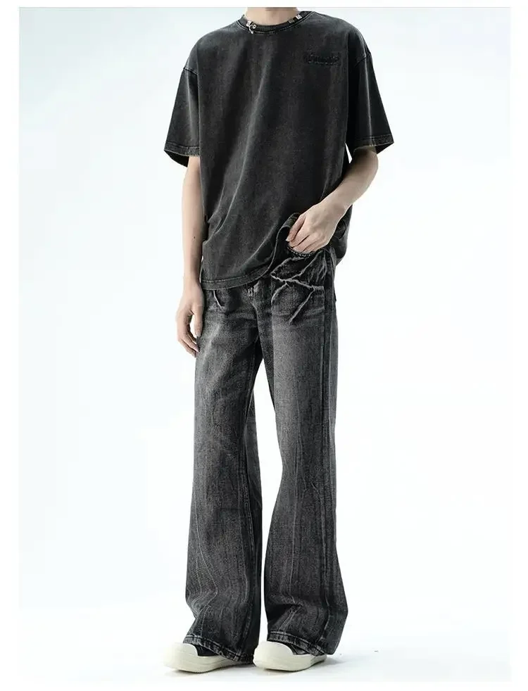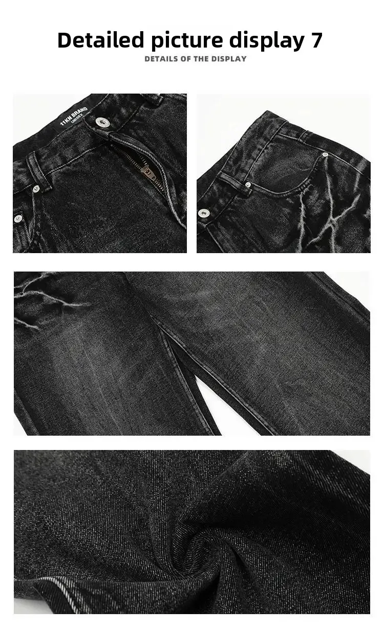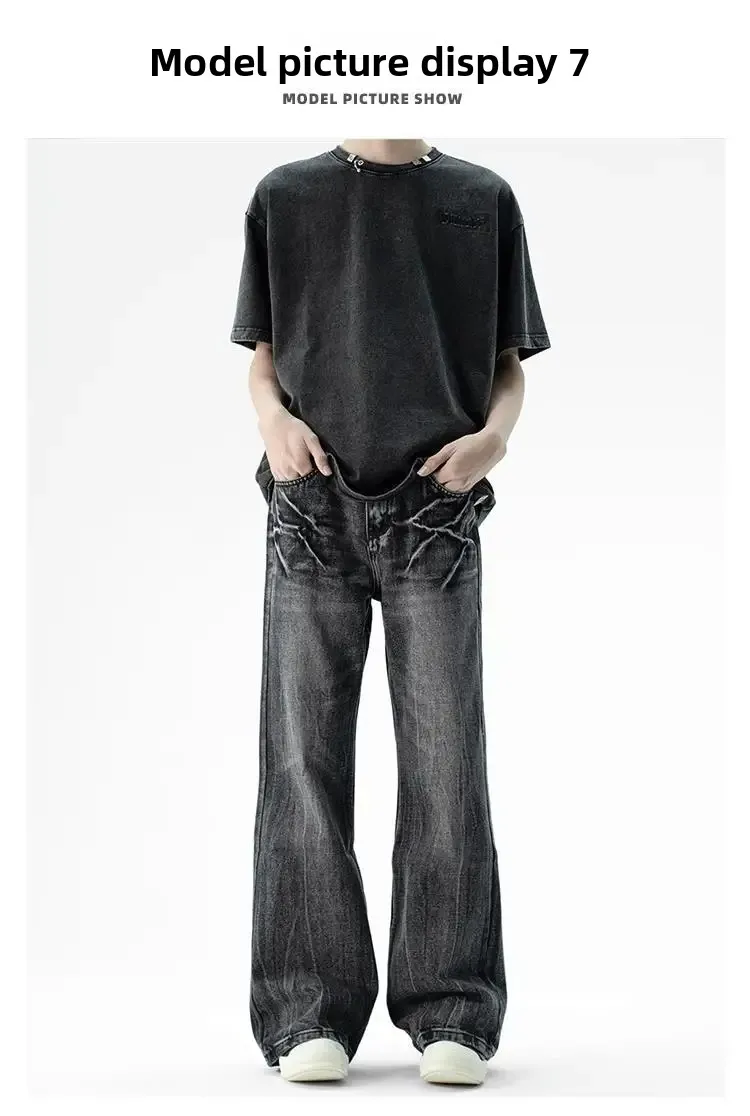Retro American Lightning Pattern Men's Jeans High Waist Bootcut Long Trousers Hip Hop Style Straight Leg Black Washed Denim
