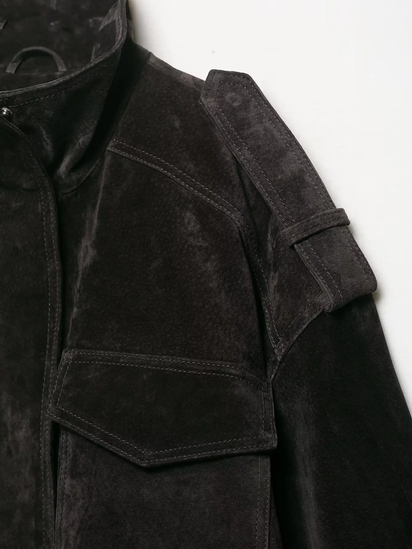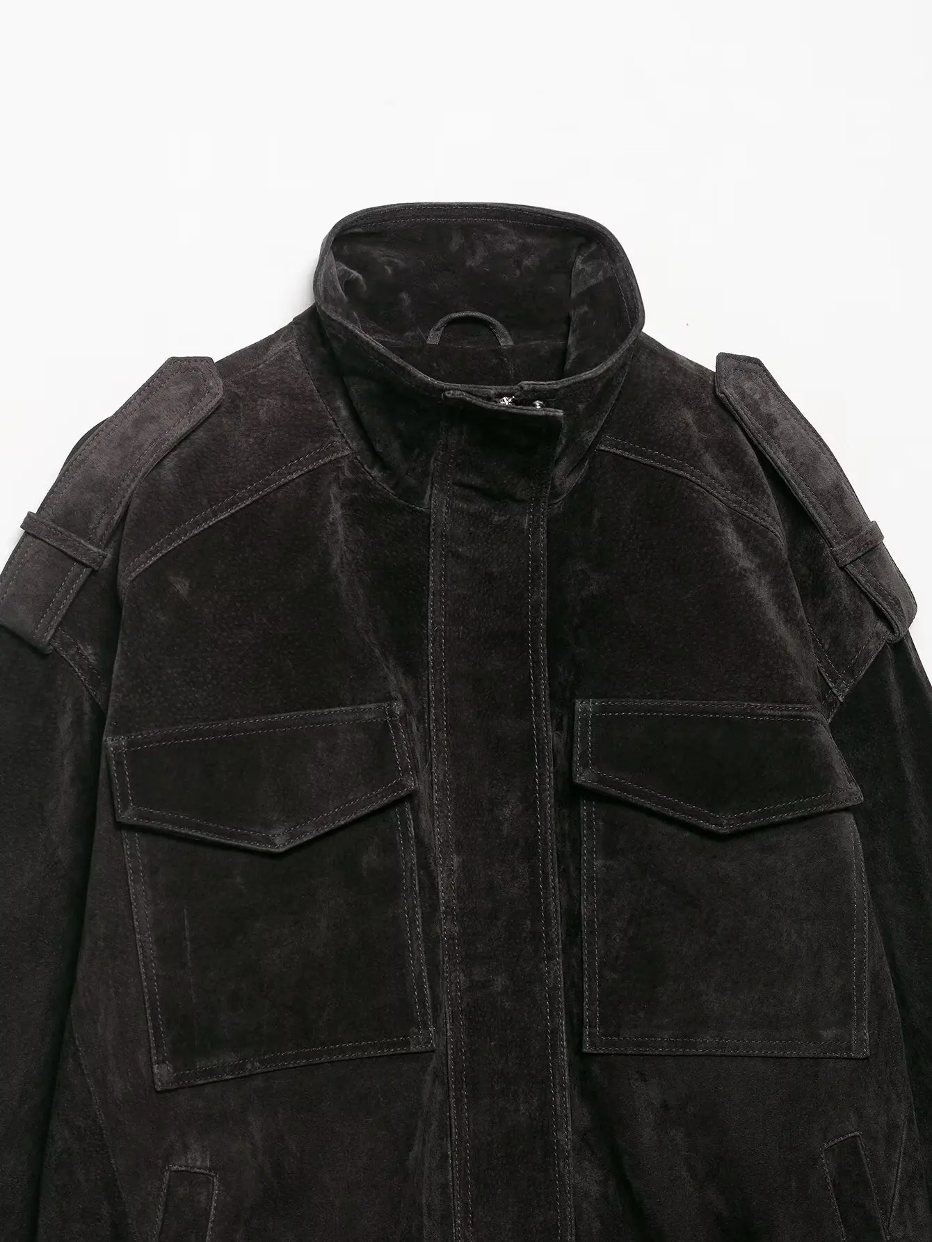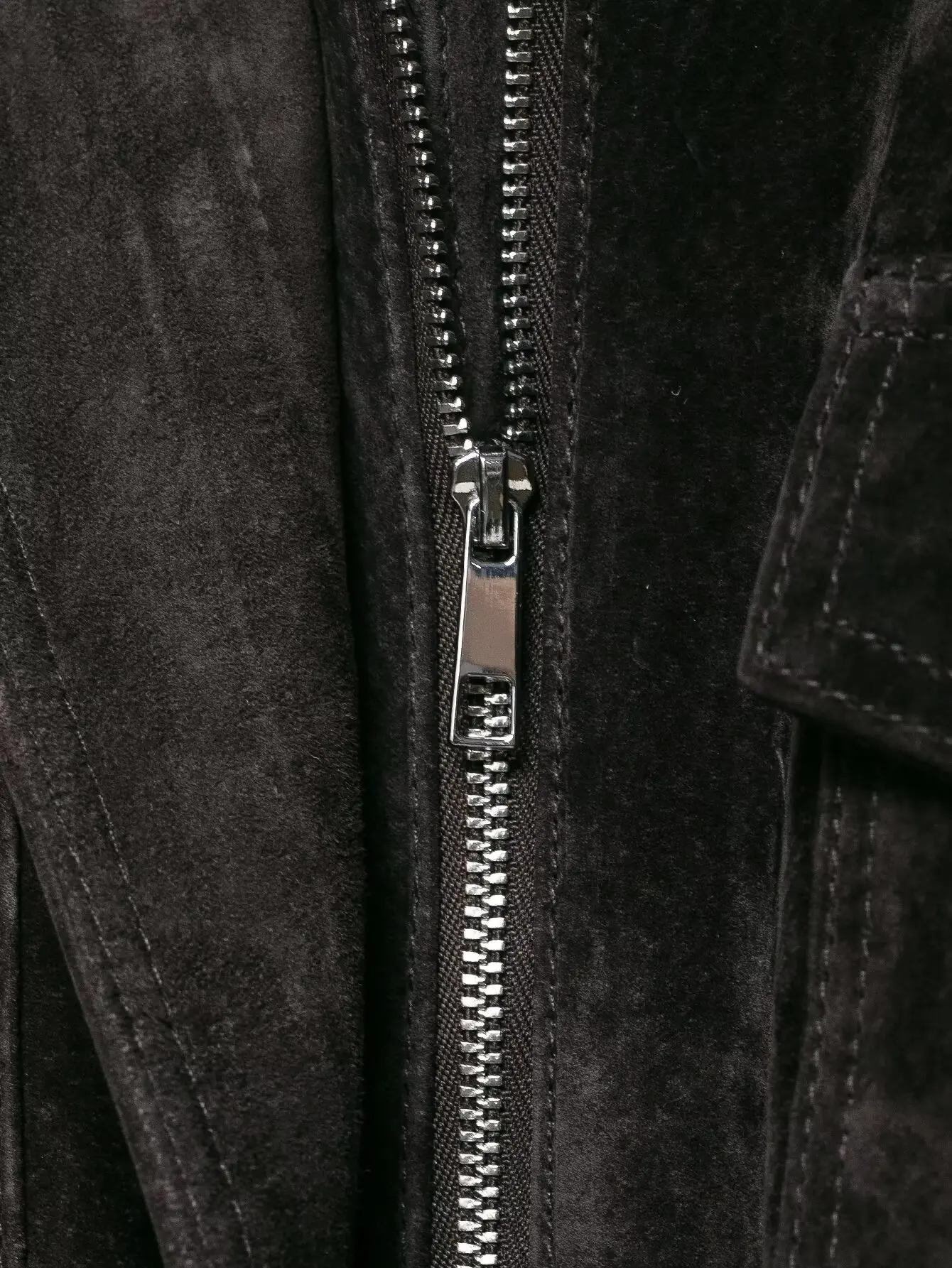 Crafted from premium polyester, this leather jacket offers a luxurious velvet texture and durable construction for long-lasting wear.