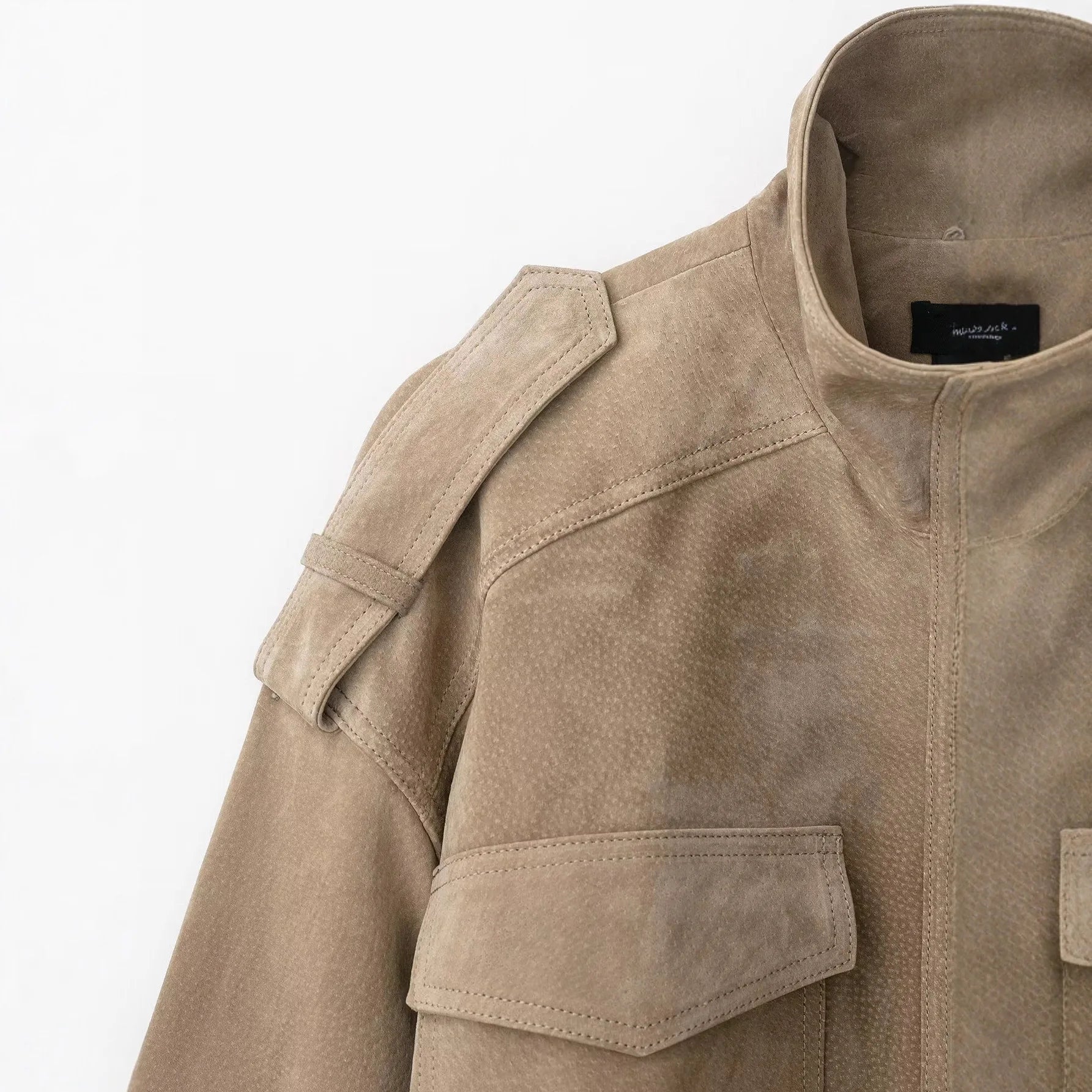 Featuring a retro American street style with a stand-up collar and a sleek, solid color design, this jacket exudes a cool, urban vibe.
