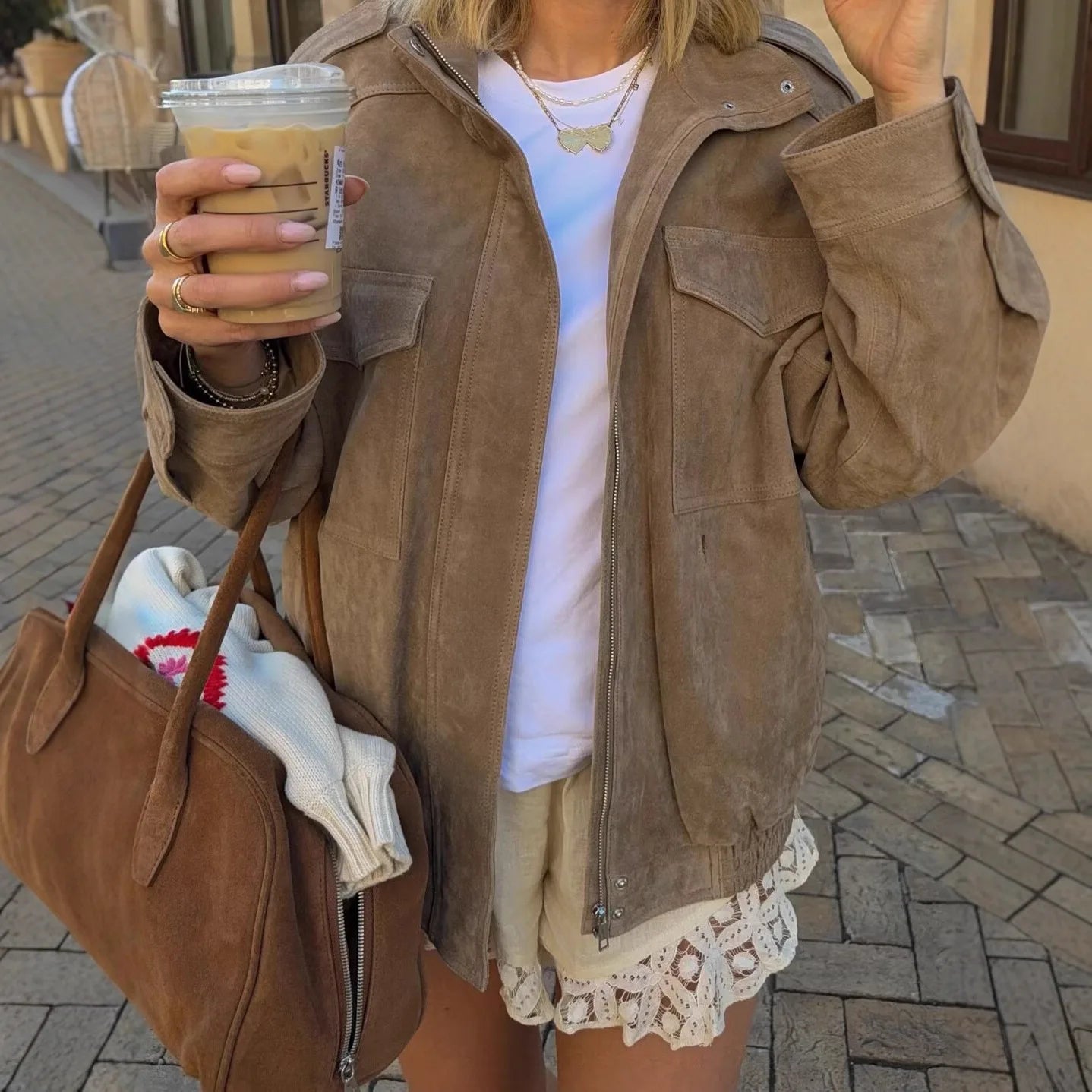 Equipped with practical pockets and a secure zipper closure, this jacket combines functionality with fashion.