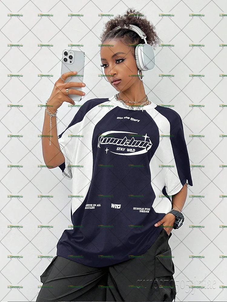 Women's Summer Autumn Streetwear Oversized Racing Motorcycle Print Color Block Raglan Sleeve T-Shirt Casual Loose Tops Y2k Tees