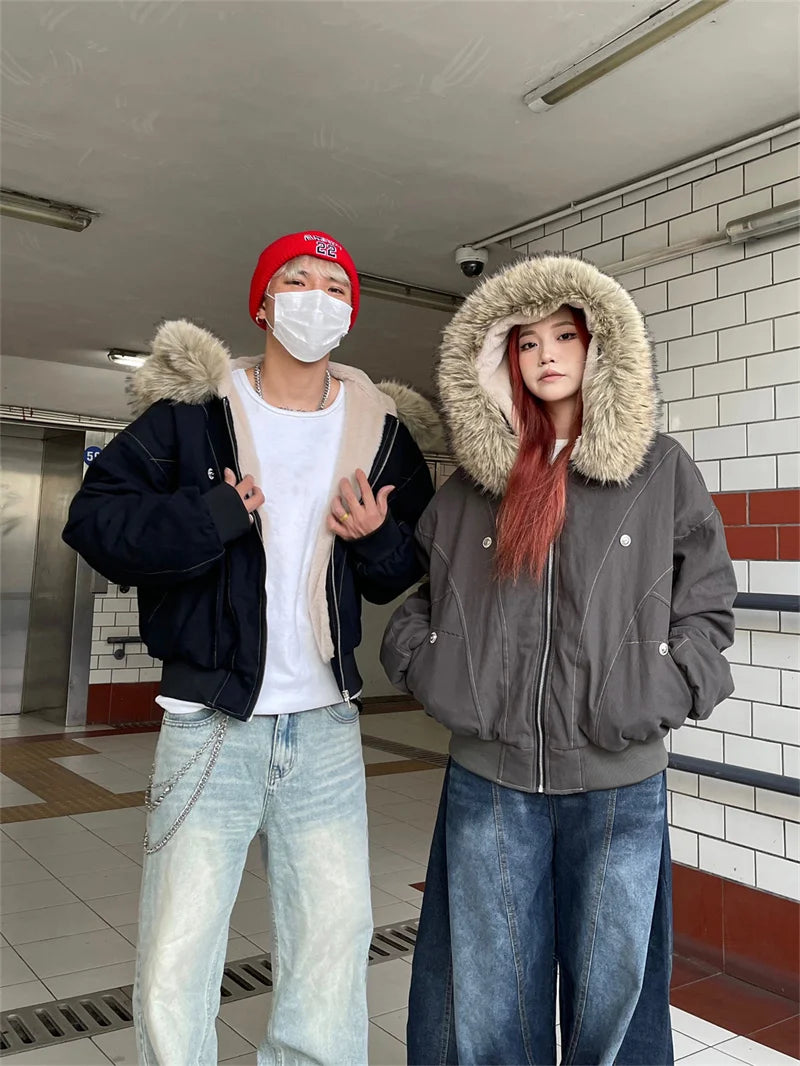ZAROY Fur Collar Hooded Parkas Y2k Harajuku Thicken Padded Jackets Casual Zipper Gothic Women&Men Winter Coats Streetwear кур